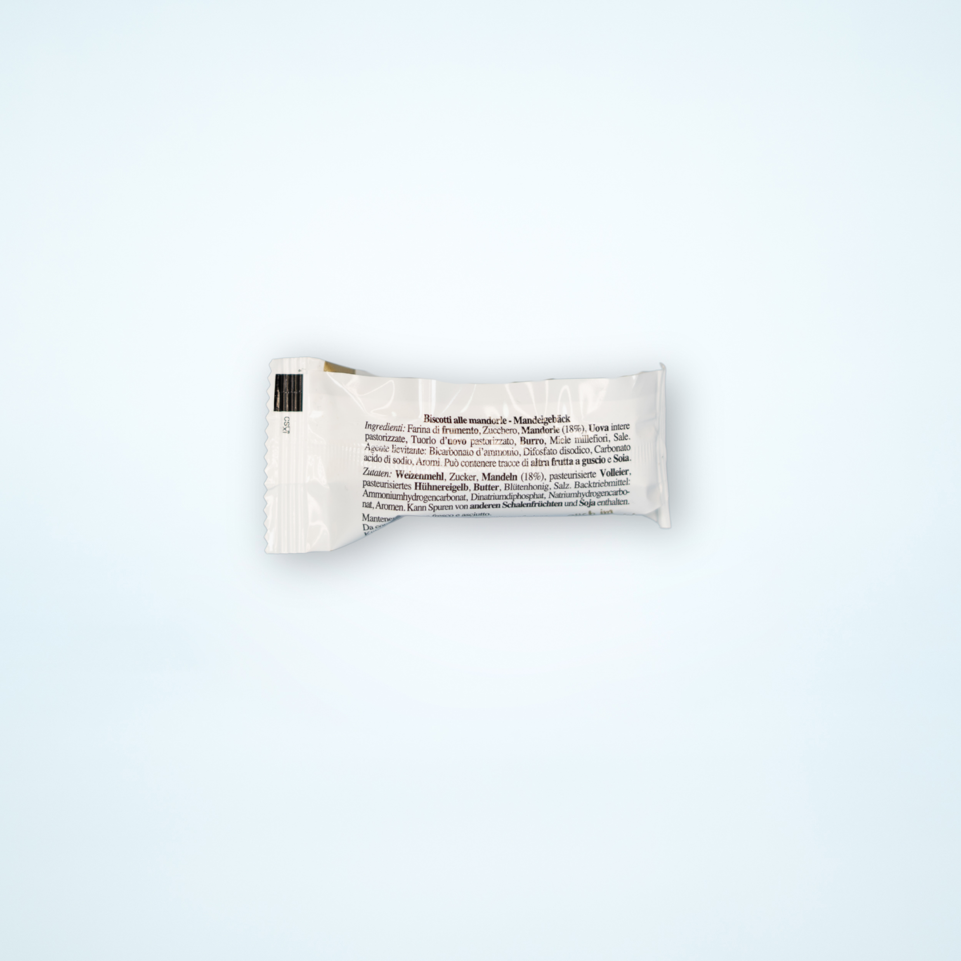 Zutaten und Allergene: Weizenmehl, Zucker, Mandeln (18%), pasteurisierte Volleier, pasteurisiertes Eigelb, Butter, Blütenhonig, Salz. Backtriebmittel: Ammoniumhydrogencarbonat, Dinatriumdiphosphat, Natriumhydrogencarbonat, Aromen. Kann Spuren von Schalenfrüchten und Soja enthalten.