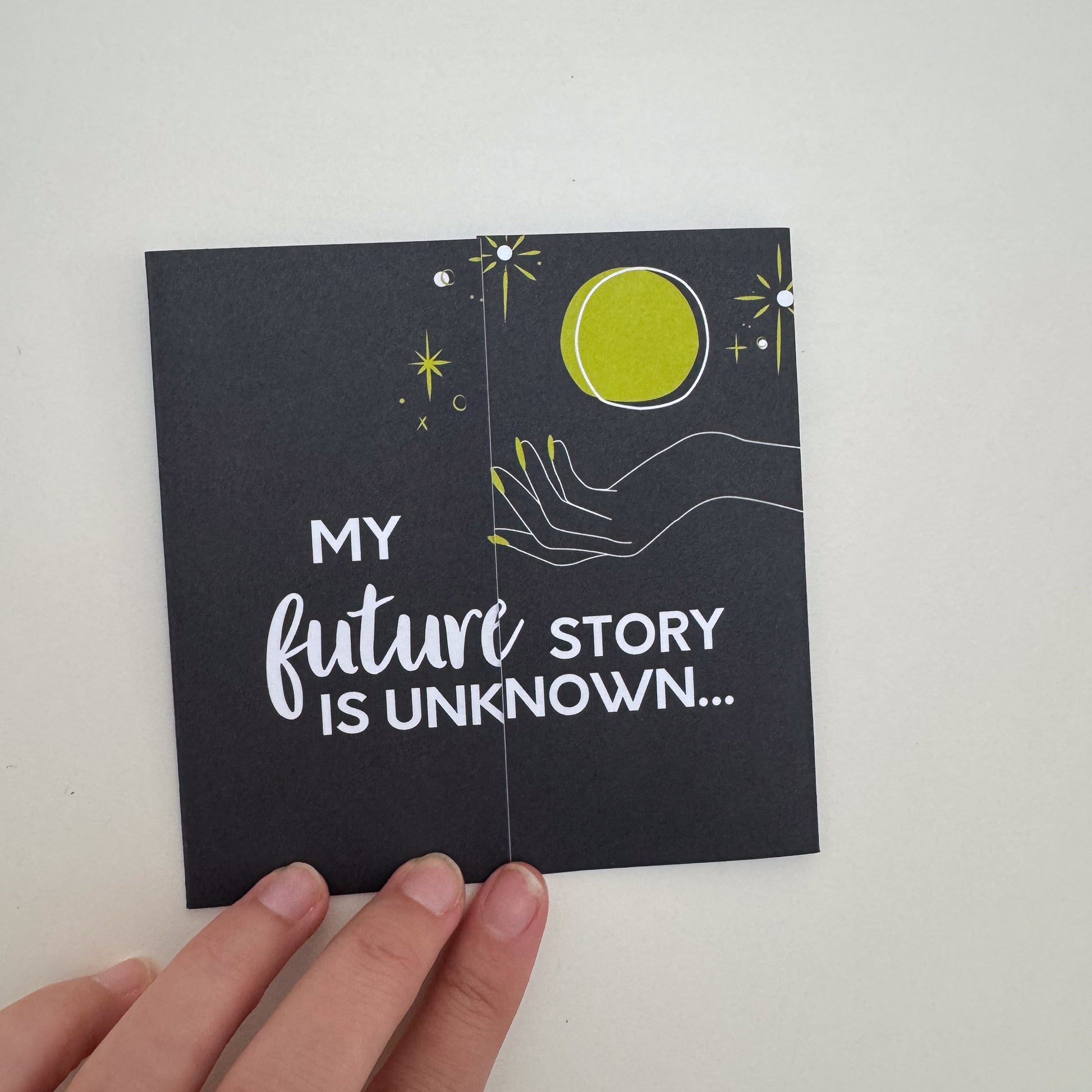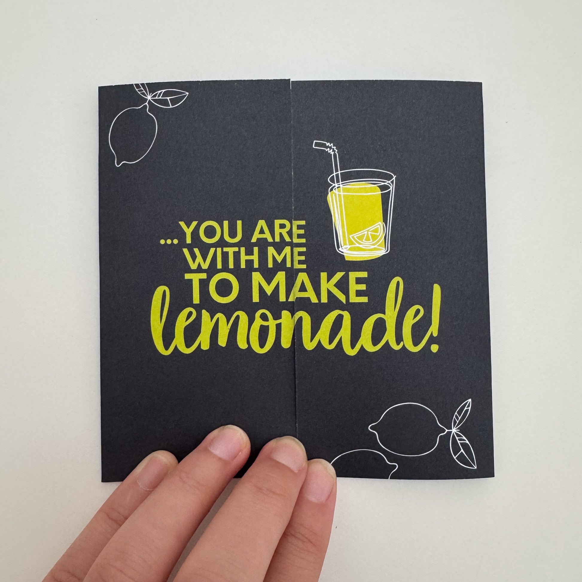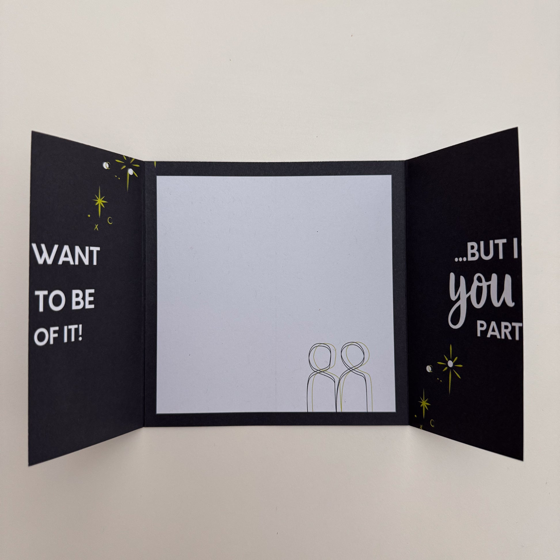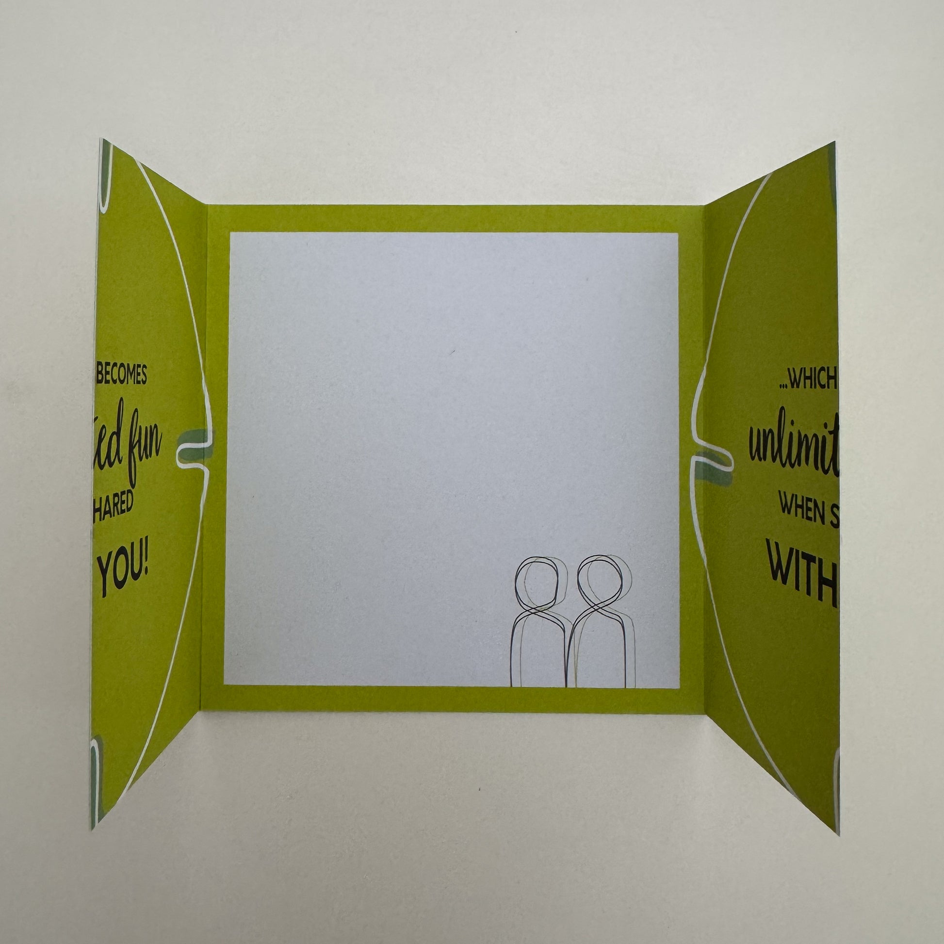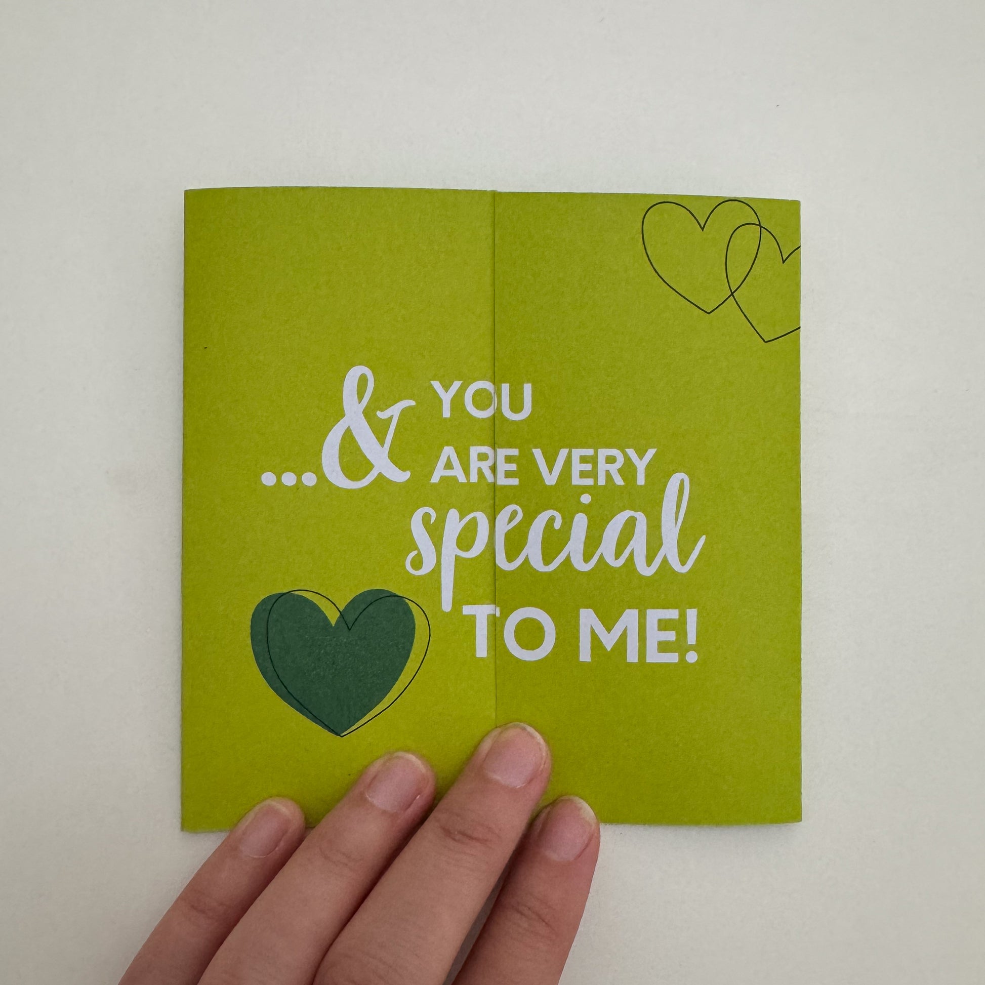 Klappe die Kartenflügeln um 360 Grad, um den 2. Teil des Spruchs zu lesen. Schau links im Video nach.
