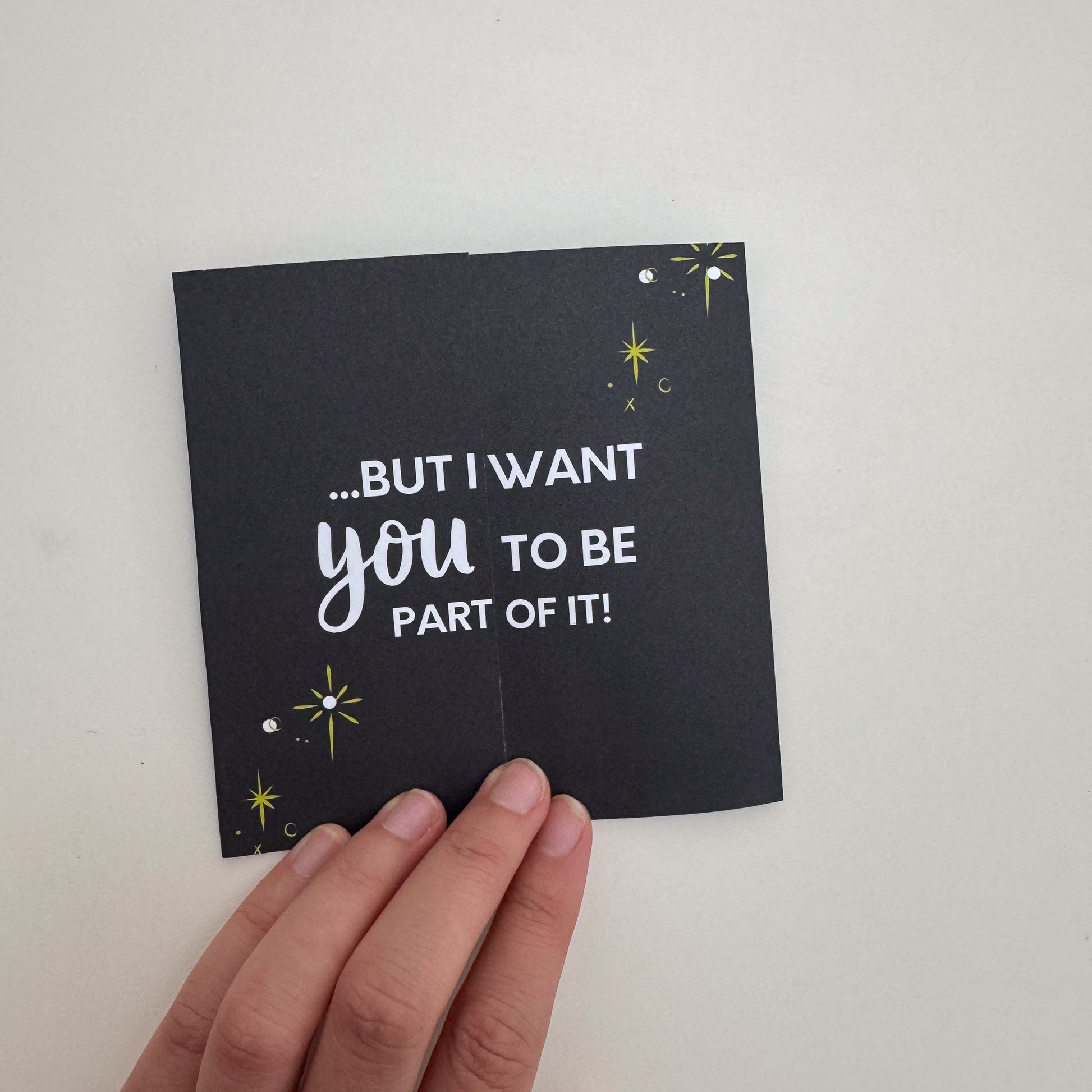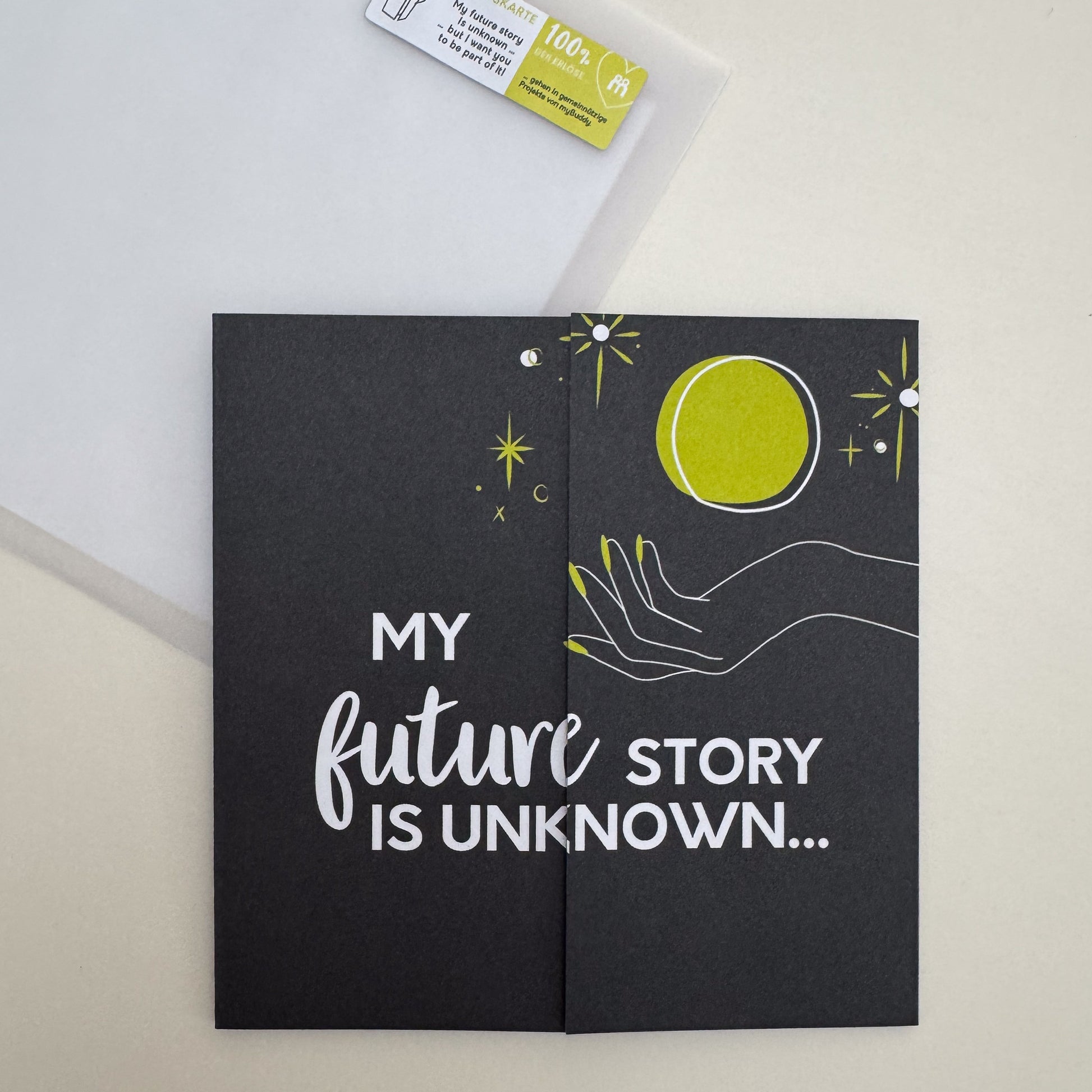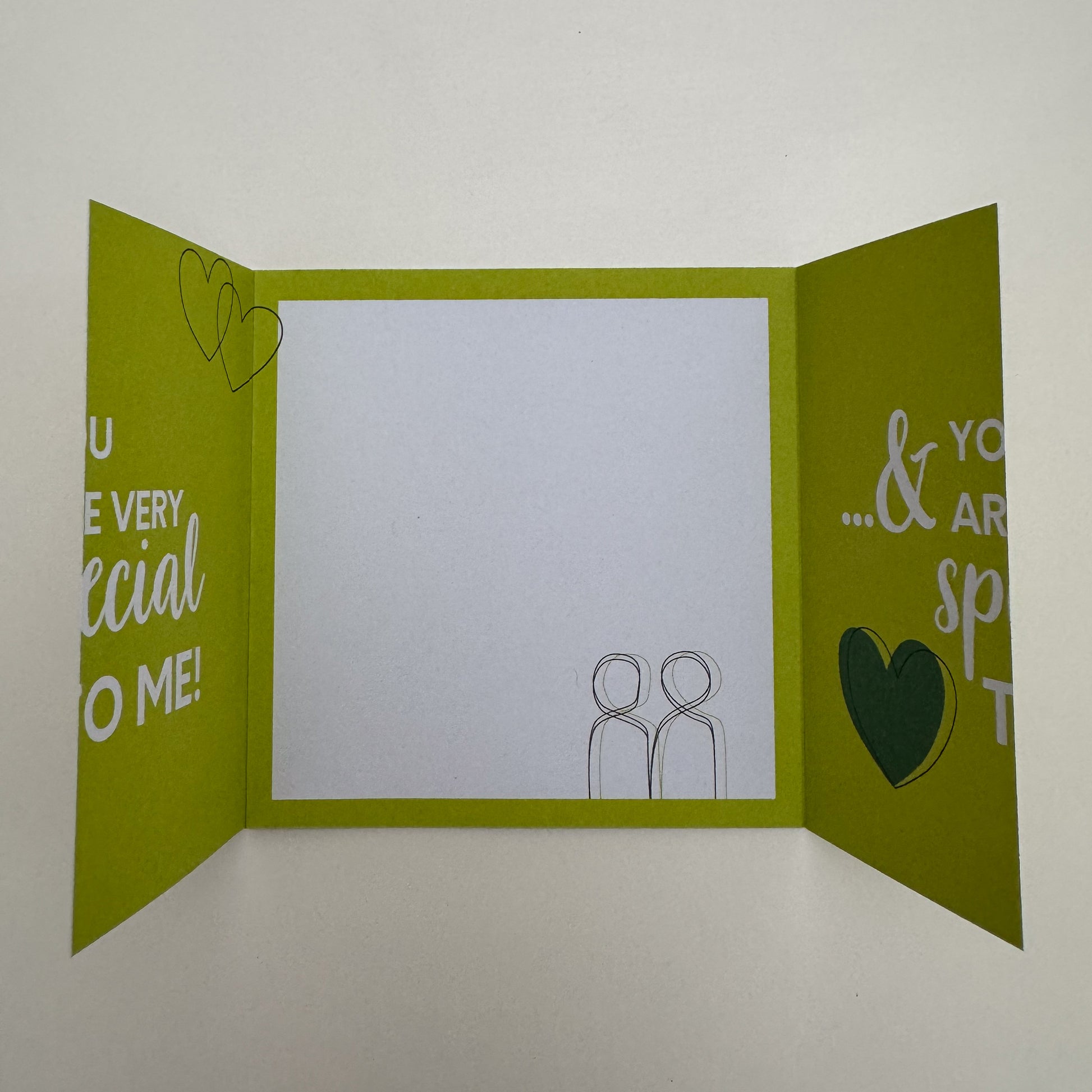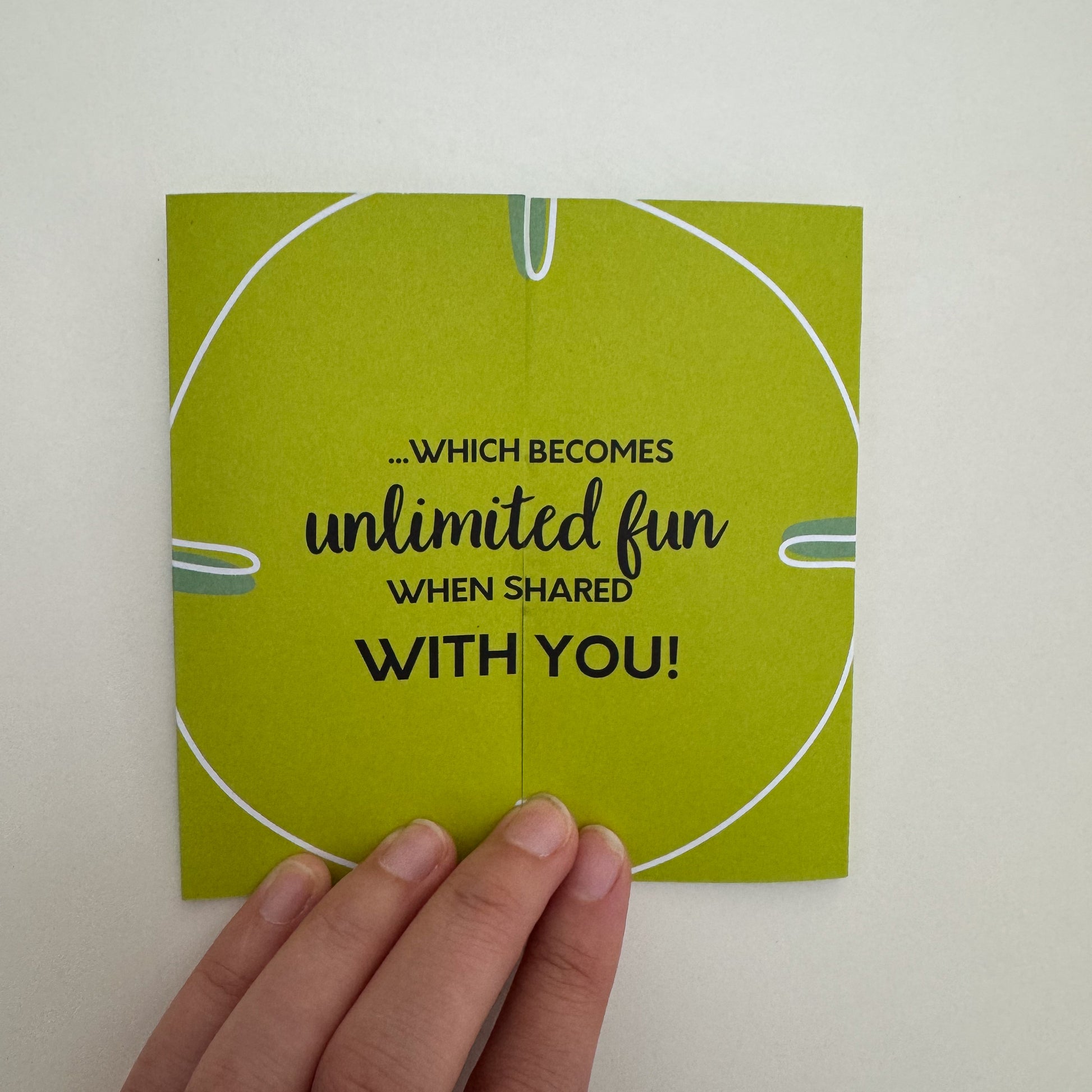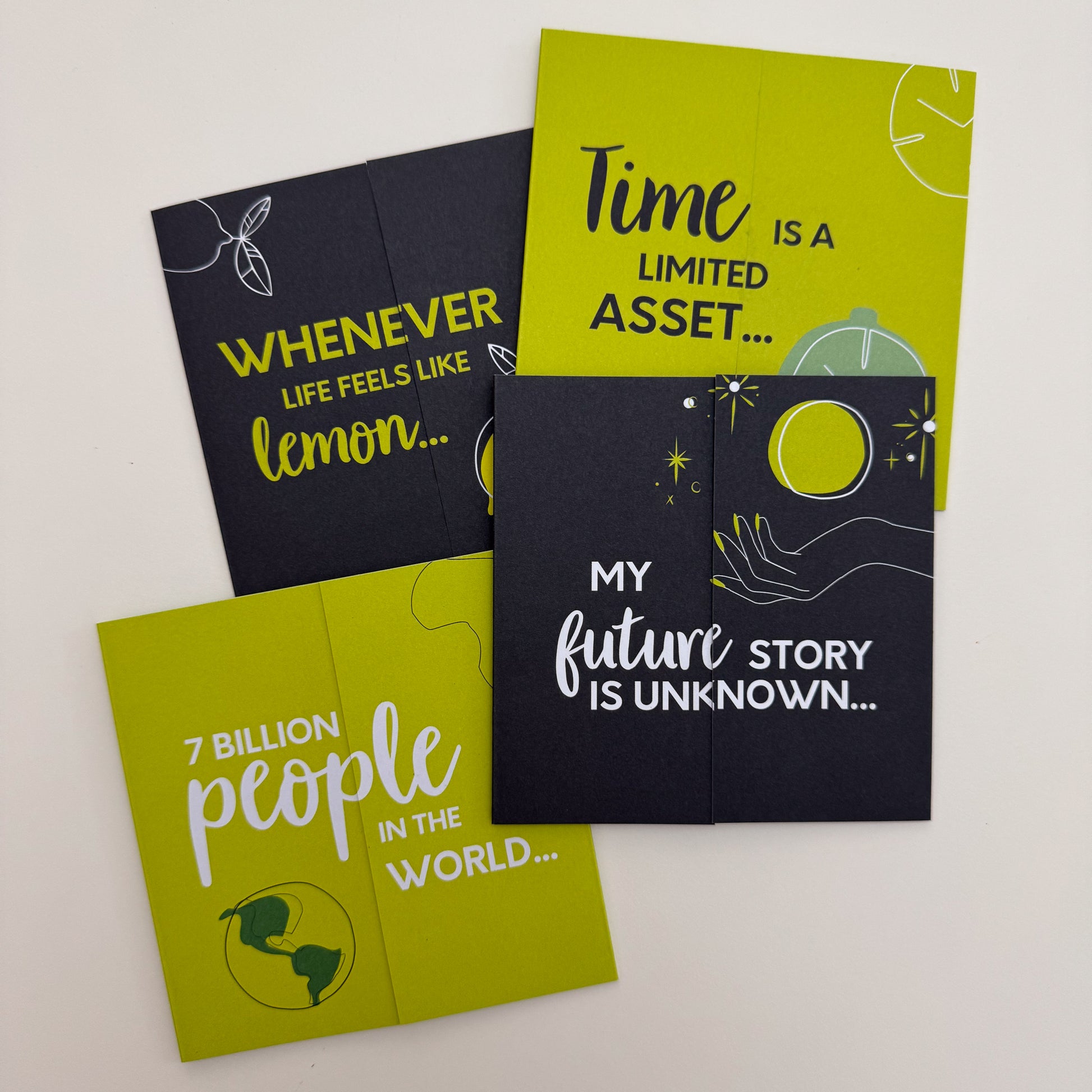 Klappe die Kartenflügeln um 360 Grad, um den 2. Teil des Spruchs zu lesen. Schau links im Video nach.